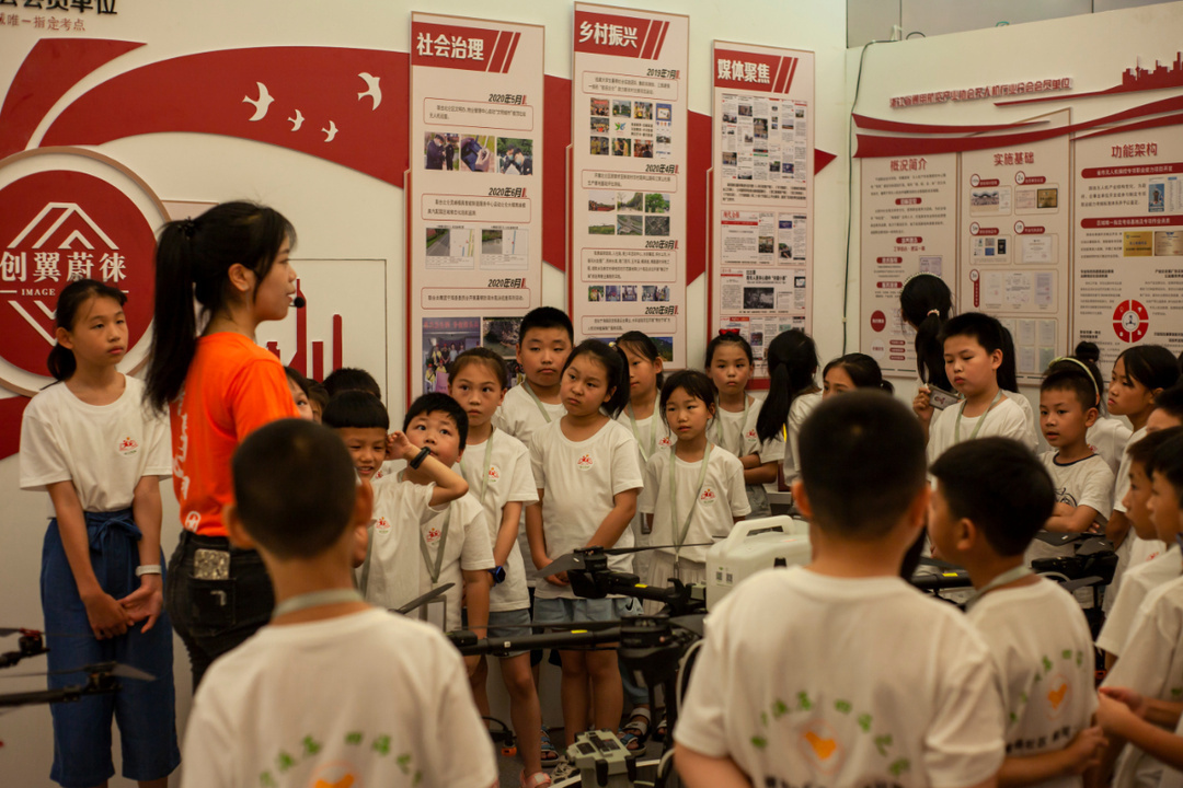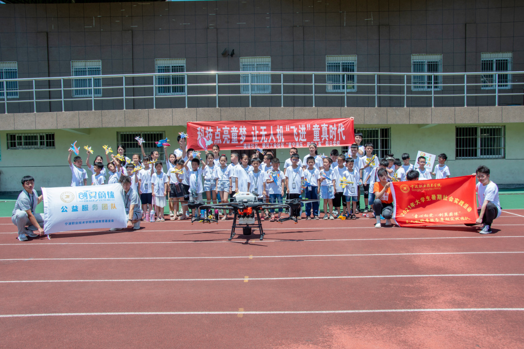 “你看!它飞得真高!”“哇!这就是传说中能够喷洒消毒的无人机么?”“老师,它能飞多久啊?”稚嫩的童声回荡在宁波职业技术学院操场上,来自宁波市北仑区大碶街道横杨社区、横河工业社区假日学校的孩子们与无人机来了一场“亲密接触”,擦出了公益科普教育的“新火花”。