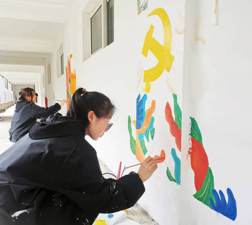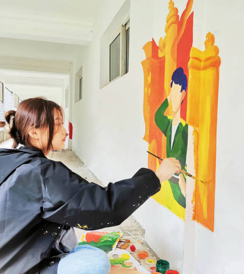 今年正值建党百年,宁职院又与北仑区全面建设党建共同体,作为一个以艺术见长的师生公益团队,“艺源”从开年初就策划了一系列的服务当地的公益项目。在一个多月前,就与郭巨街道取得联系,通过实地走访郭巨学校,商议确定墙绘形式和内容,郭巨学校将其文化走廊、支部会议室走廊外墙等多个位置交予宁职师生进行创作。郭巨学校总务处黄世东老师作为全程对接的校方人员,对此感受颇深:“起初担心纯公益服务的创作水平,得知是专业教师亲自带队,又多次提供设计效果图,心里才有底”。对于“艺源”的创作他表示:“能明显感受属于大学生的原创,没有商业味道,很符合中小学校的校园需求,看学生们会围拢过去就知道是对他们胃口的。”