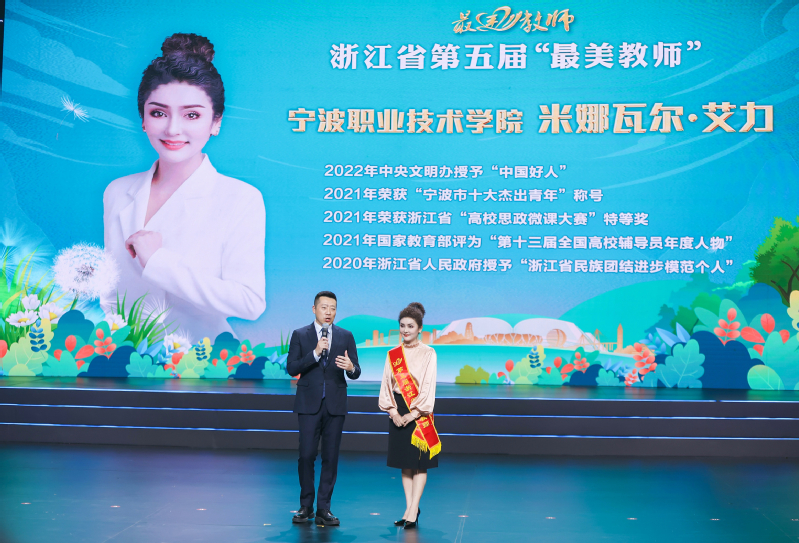 9月7日,浙江省庆祝第38个教师节暨第五届“最美教师”发布会在杭州举行,我校米娜瓦尔·艾力获此殊荣,为全省高职院校唯一获此荣誉的教师。