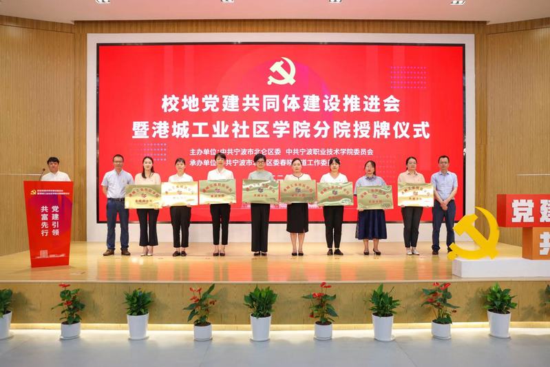 6月27日,北仑区区委和宁波职业技术学院党委在春晓湖工业社区联合举行校地党建共同体建设推进会暨港城工业社区学院分院授牌仪式。北仑区委组织部部长周成钢,北仑区委组织部副部长、区委两新工委书记江智灵,宁波职业技术学院党委副书记马苗金,宁波职业技术学院党委委员、组织部部长杨晓波等领导出席活动,各街道、社区负责人、企业代表、宁职院师生代表参加活动。